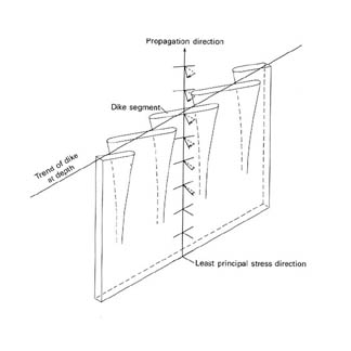 -> Two theories have been proposed to explain the rotation of dikes into en echelon segments as they rise to the surface: